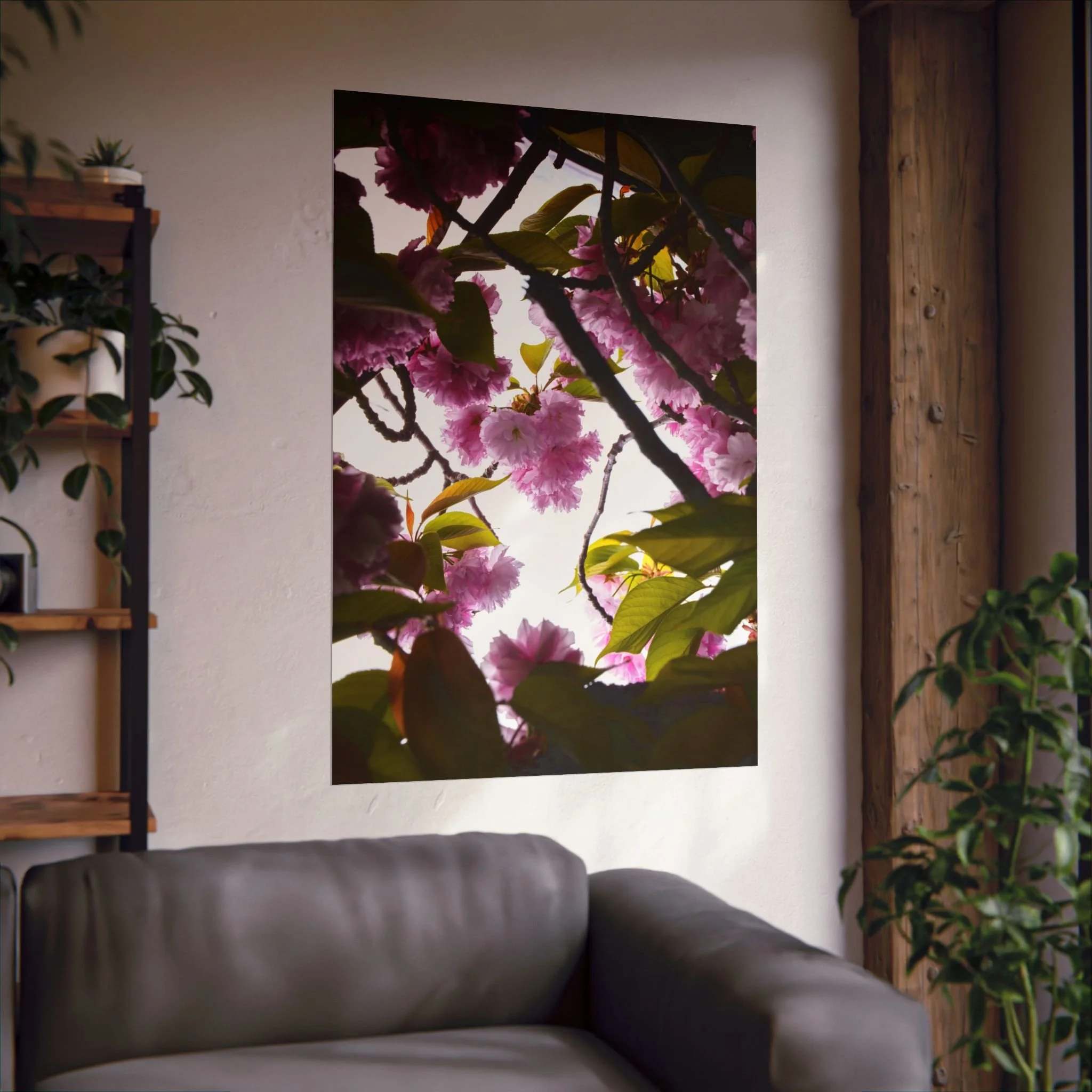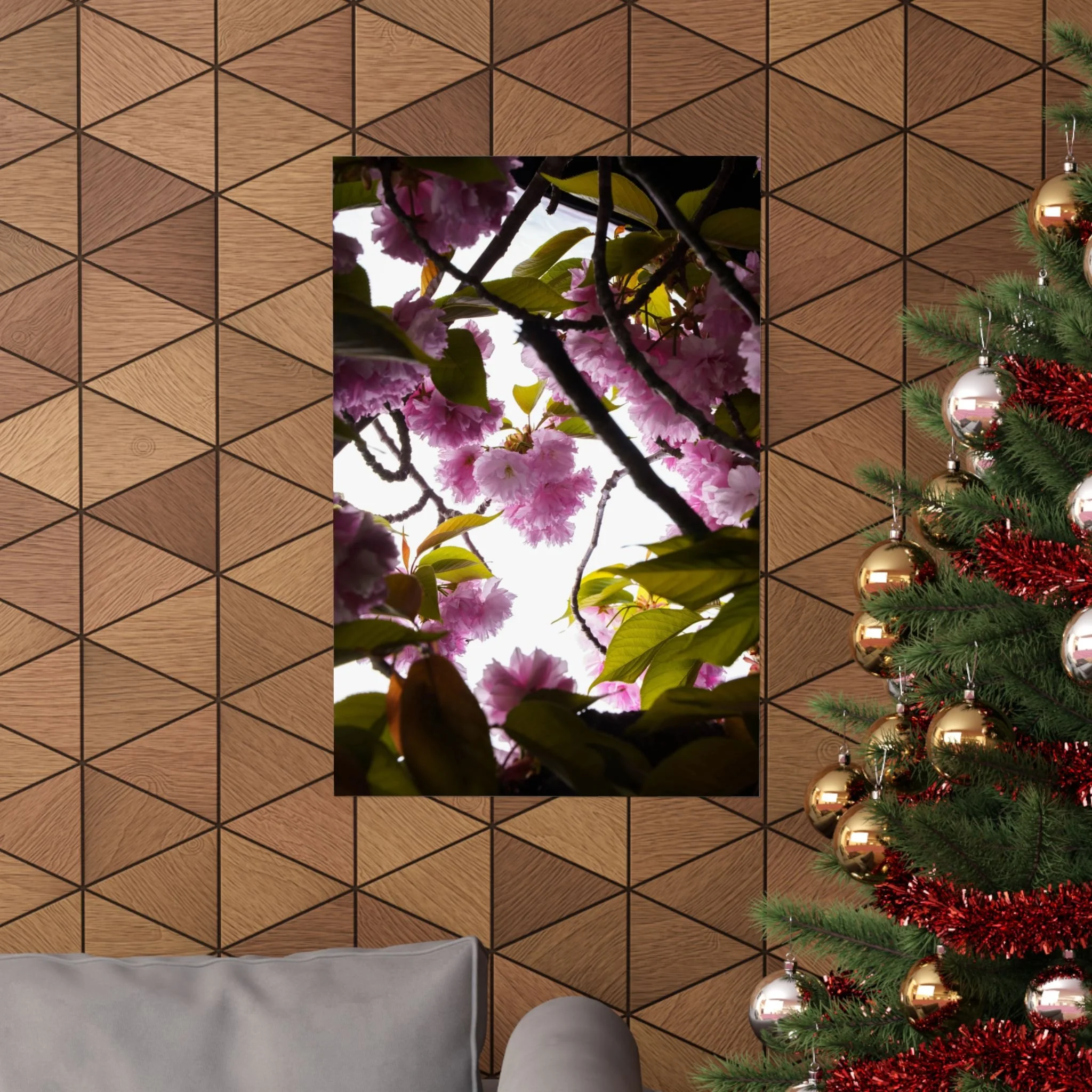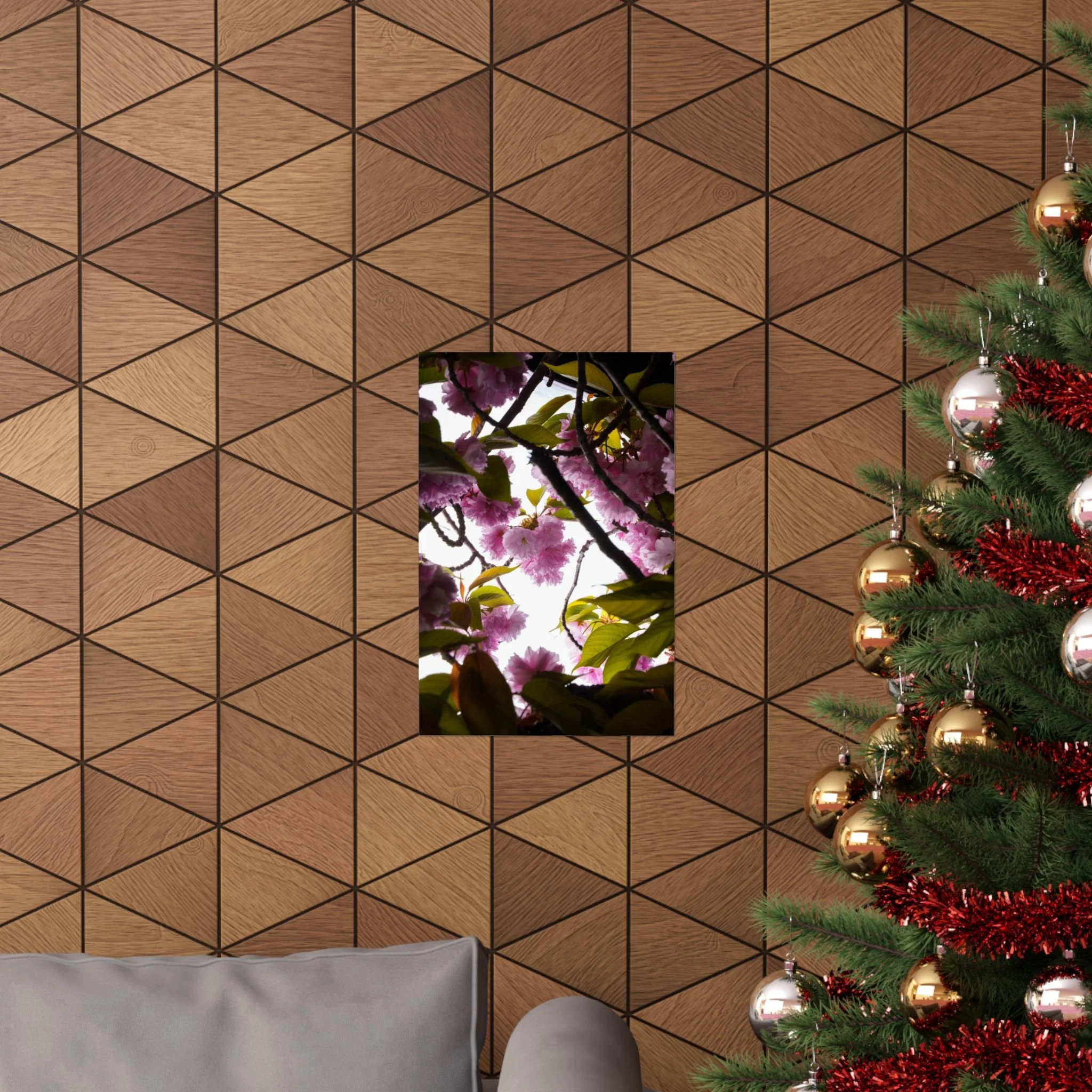 Soft, mat-finished photographic poster capturing a canopy of pink blossoms against bright sky. The vertical composition draws the eye upward through layered branches and leaves, creating a quiet, immersive moment—like pausing beneath flowering trees on a late-spring afternoon. Printed on archival museum-grade paper with giclée inks, colors stay vivid while the matte surface reduces glare for a calm, gallery-like presence on your wall. Looks at home in living rooms, bedrooms, studios, or sunlit hallways, bringing a gentle botanical mood without fuss.