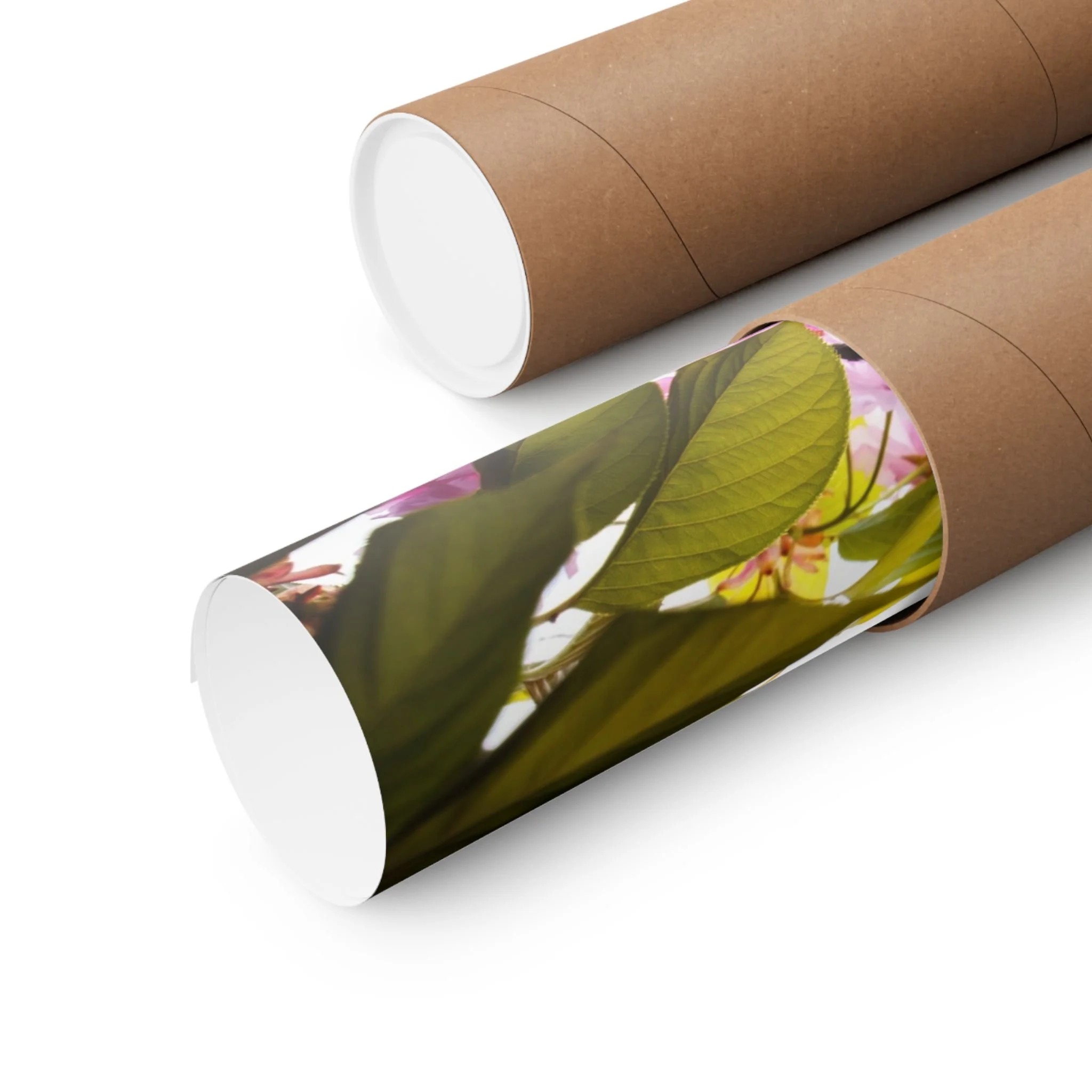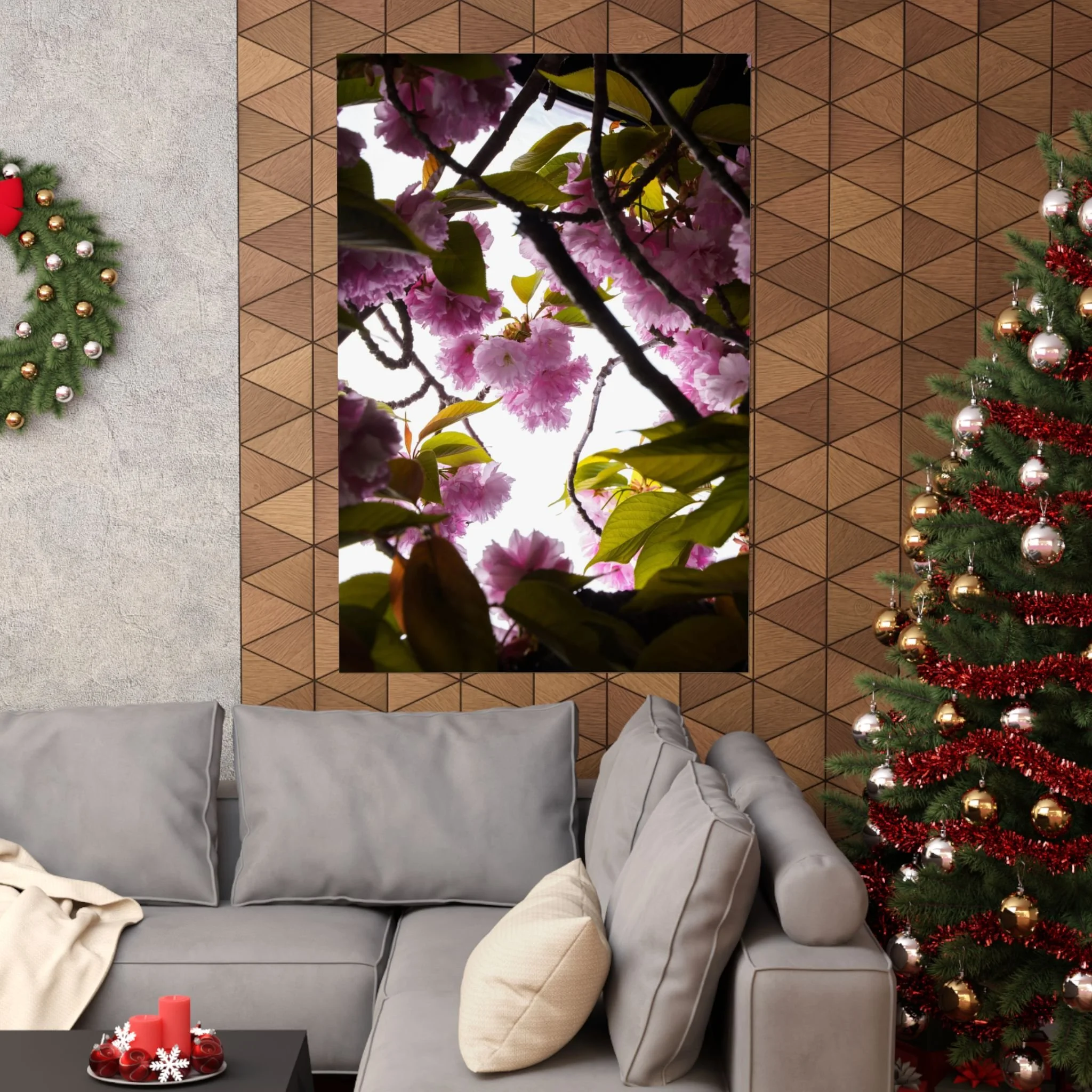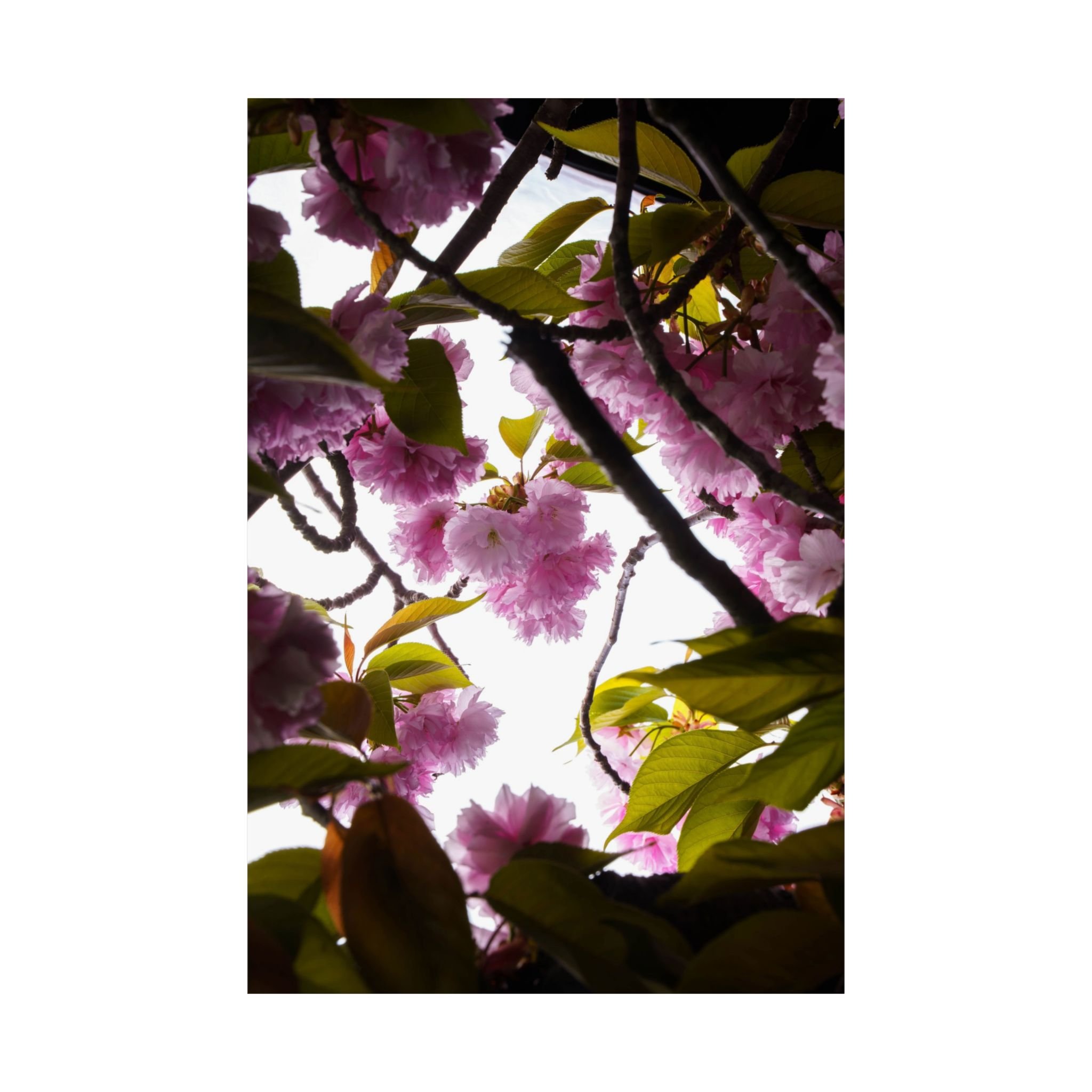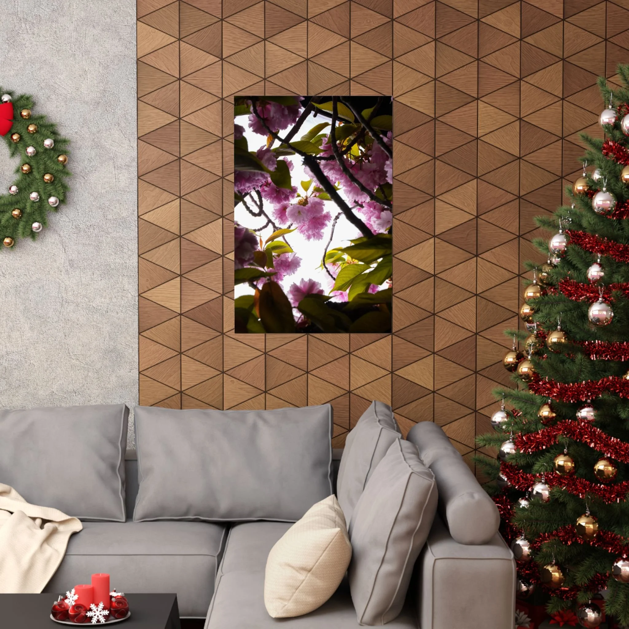 Soft, mat-finished photographic poster capturing a canopy of pink blossoms against bright sky. The vertical composition draws the eye upward through layered branches and leaves, creating a quiet, immersive moment—like pausing beneath flowering trees on a late-spring afternoon. Printed on archival museum-grade paper with giclée inks, colors stay vivid while the matte surface reduces glare for a calm, gallery-like presence on your wall. Looks at home in living rooms, bedrooms, studios, or sunlit hallways, bringing a gentle botanical mood without fuss.